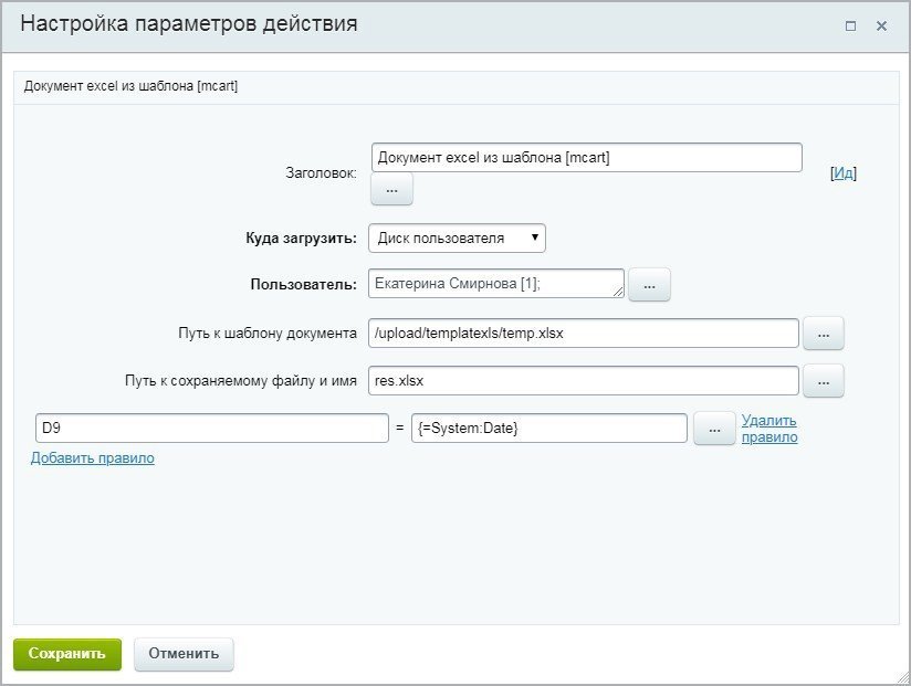 3. Путь к шаблону документа — укажите путь до файла-шаблона (обязательно с расширением xlsx). Например: /upload/templatexls/temp.xlsx.
